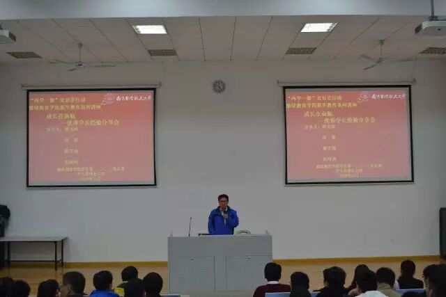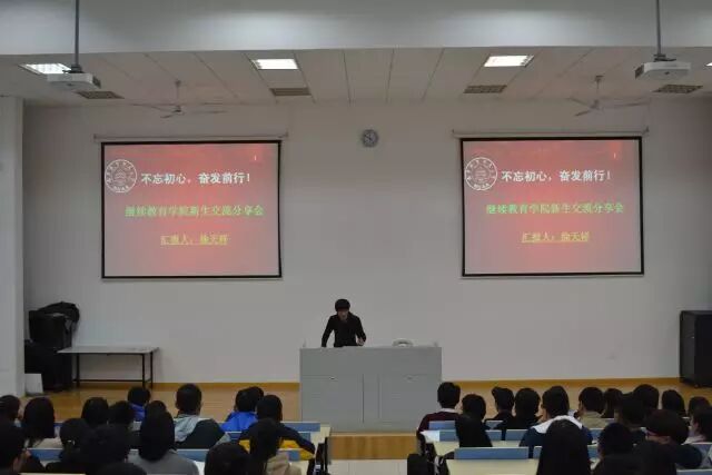 “授人以鱼不如授人以渔”,为了让大一新生们在未来的四年中,明确方向,坚定初心。南京航空航天大学继续教育学院学生第一、二、三党支部以及学生管理办公室于2016年11月16日19时在明故宫校区13号楼报告厅联合举办了新生教育系列讲座。本次到场的老师有我院团委书记黄超峰老师、辅导员熊啟龙老师、李以秀老师、张丽老师、戴安娜老师。四位讲座嘉宾为徐天祥同学、高寒同学、蔡雪艳同学、田邳州同学。